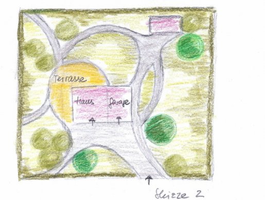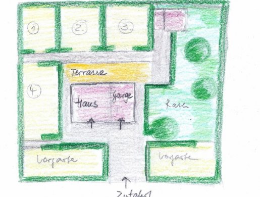 Das neue Gartenoberhaupt sitzt nun über einem Lageplan mit Haus und vorhandenen Bäumen und Sträuchern. Es überlegt, wie Wege, Stellplatz, Garage, Gartenhaus, Kompostflächen und Beete sinnvoll angelegt werden sollten.